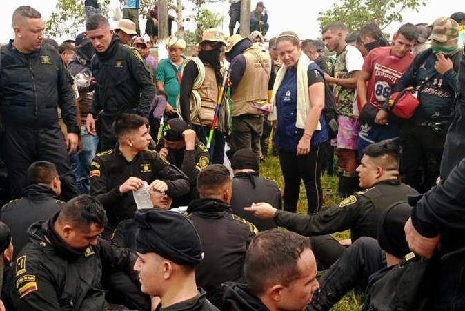 Foto de portada: Fotografía cedida por la Defensoría del Pueblo de Colombia que muestra a miembros de la policía ser detenidos durante una protesta de campesinos e indígenas el 3 de marzo de 2023, en el municipio de San Vicente del Caguán, departamento de Caquetá