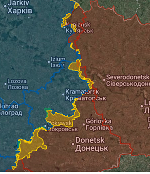 Vayamos al frente de batalla. Las operaciones se siguen realizando con el mismo sentido general que vemos desde hace más de un año (febrero de 2024) luego de la toma de Avditka por las fuerzas rusas. Los combates mantienen una secuencia en muchos casos micro táctica (sin grandes intentos de unidades mayores al pelotón o compañía) acumulativa que en su conjunto van mostrando una lenta pero sostenida evolución rusa, que en el sector mencionado del frente es claramente visible. La secuencia se caracteriza por una presión rusa que consigue ciertos avances, contraataques ucranianos que recuperan algún territorio, nuevos pequeños avances rusos y contraataques ucranianos. En el balance las fuerzas de Moscú ganan sistemáticamente pequeños territorios, aldeas, algunas casas, una fábrica, un ala de una fábrica, un monobloc, una elevación (todo en ruinas). Como se ve en el mapa a lo largo de este año han conquistado el espacio que aparece en amarillo mientras que los de Kiev recuperan lo que se ve en verde en estos días. Aquí vemos el primer y más directo escenario de construcción de relato: no hay grades avances rusos ni los ucranianos aparecen en condiciones de hacer otra cosa que retroceder paso a paso, sin embargo, en el escenario público los “combatientes” del frente de generación de ideas nos dicen otra cosa. De hecho, cada bando ha logrado que su relato sea asumido por decisores políticos, con el daño que esto puede implicar para afrontar la realidad (sin dudas más en el caso de Europa donde parece que las esferas superiores de decisores estar imbuidas de su propia “narrativa”).