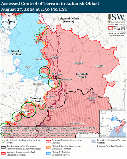 Las operaciones se desarrollan si recorremos de norte a sur en los sectores de Kupiansk en el Oblast de Járkov, generando un intento de cerco operativo sobre esta ciudad; la que había sido recuperada por Ucrania a fines del 2022, y capital rusa del Oblast durante la administración de Moscú. Bajando una segunda línea operativa de da en dirección de Izium-Liman-rio Oskill, posiciones estratégicas también recuperadas por Ucrania en setiembre-octubre del 2022 en una ofensiva exitosa de ese año (después de duros combates en todo al intento ruso de cruzar el río); estas posiciones, de tener éxito la progresión rusa, serian claves para amenazar a Slaviansk desde el norte y colocar a las fuerzas rusas en condiciones de plantearse tomar todo Donetsk. Más hacia el sur en la zona de Bajhmut y Toresk los rusos presionan de frente hacia Kromatovsk desde las posiciones que dejo la acción protagonizada por Wagner. Mas al sur se sigue desarrollando la que ha sido todo el 2024 y 2025 el principal esfuerzo ofensivo ruso que absorbe según algunas informaciones a más de 100000 hombres rusos y algunos menos de Ucrania, es el intento de toma de Pokrovsk en donde vemos dos brazos que constituyen ya un “cerco operativo”; hace unos meses en el 2025 el peso de los combates se corrió del brazo sur al norte, allí este mes de agosto se produjo una ruptura rusa táctica que amenazó ser operativa y encendió todas las alarmas en occidente, Kiev concentró grandes esfuerzos de contención y contraofensiva hasta hoy con éxito. Siguiendo hacia el oeste los rusos han penetrado levemente en el oblast de Dnipropetrovsk, allí también existen varias aldeas en disputa y contraofensivas ucranianos estos días, aunque dudamos que este sea un frente donde se canalice el esfuerzo principal ruso. Finalmente, en el oeste sobre el río Dniéper, frente de Zaporiyia se registran asaltos rusos de pequeñas unidades y fuertes ataques con drones sobre a retaguardia inmediata de las fuerzas ucranianos (estos bombardeos masivos de artillería y drones son una característica de todas las zonas donde se realizan o van a realizar operaciones), aunque si bien no podemos negar que no haya esfuerzos rusos de envergadura en el futuro, no pareciera ser una dirección primordial en este momento. Este vuelo de pájaro sobre el frente y sus zonas de combate no niega que en todos los sectores del frente se pelea en forma permanente, pero más allá de esto se encuentran “casi” fijos a lo largo de este año (los que mencionamos como sujetos a operaciones son más de la mitad de los Km no cubiertos por el rio Dniéper).