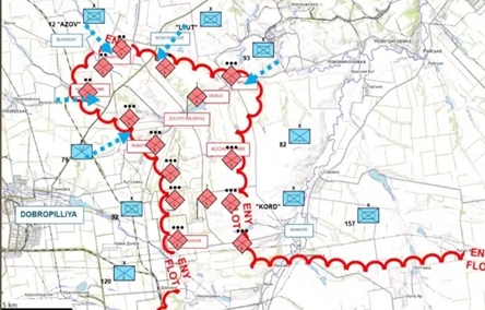 Pero eso finalmente no sucedió[2]. El Estado Mayor de las Fuerzas Armadas de Ucrania movilizó urgentemente al 1er Cuerpo de Azov para detener la fuerza de ataque rusa y estabilizar el frente. Los Azov, que son la elite ucraniana, descubrieron la debilidad de la fuerza de ataque rusa: el rápido avance, la falta de suministros logísticos y la estrecha anchura de la punta de lanza. No sabemos (o no estamos en condiciones de afirmar) cuántas fuerzas implicaron los rusos en esta ruptura (debe tenerse en cuanta que cuando se habla de “Brigadas” se refiere a componentes de estas: un batallón o una parte menor muchas veces). Las ideas planteadas van desde grupos de infiltración de infantería apoyados por drones (varios cientos y no mucho más). Hasta la implicancia de fuerzas operativas de mayor rango para intentar realizar la maniobra que describimos, o ampliar y consolidar la saliente (que no era poco).