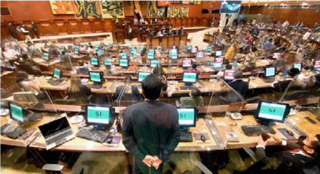Este mecanismo, que también puede activarse desde el Presidente de la República (Art. 148), por ello se conoce como “Muerte Cruzada”, le da la potestad para disolver la Asamblea, aunque en ese caso, se mantiene en funciones hasta la realización de nuevas elecciones, fue diseñado en la Constitución de 2008, precisamente para momentos como los que atravesaba el Ecuador, de grave crisis política y conmoción interna y para evitar la dirimencia de las Fuerzas Armadas; fue concebida como un incentivo negativo de contención de las diferentes fuerzas, pero que, al mismo tiempo, permita una salida democrática a momentos de conmoción y no a través de “golpes parlamentarios”, por fuera de la Constitución, con los que los partidos políticos, aprovechaban de la lucha social para realizar recambio de las élites como ya sucedió en Ecuador en los años 1997, 2000 y 2005. Según lo dispuesto en el artículo 130 de la Constitución de la República y artículo 51 de la Ley Orgánica de la Función Legislativa (LOFL), este mecanismo se activa con la solicitud de, al menos, una tercera parte de los integrantes de la Asamblea es decir, 46 de los 137 asambleístas, cual el Bloque de la Revolución Ciudadana, que tiene 47 legisladores podía hacerlo di rectamente, aunque para aprobar la “Muerte Cruzada” se necesita de las dos terceras par tes de la Asamblea Nacional (92 votos). Según la LOFL, una vez presentada la solicitud, el Presidente de la Asamblea, debía convocar, con al menos 24 horas de anticipación, tanto al Pleno de la Asamblea Nacional, como al Presidente de la República, para que haga sus respectivos descargos. El sábado 25 de junio fueron citados los Asambleístas y el Presidente de la República, que no concurrió personalmente, a pesar que la ley señala que lo debe hacer directamente, sino a través del Secretario Jurídico de la Presidencia y adicionalmente, volvió a derogar el Decreto 459, que establecía el Estado de Excepción, con lo que pretendía eliminar el argumento de que ya no existía conmoción interna, a pesar que la violencia se incrementaba, incluso con la aparición de dirigentes políticos cercanos al Presidente Lasso, que llamaban a armarse para atacar a los manifestantes.