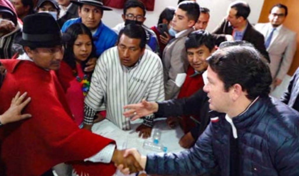 Presionado el Ejecutivo por el desenlace del debate parlamentario, en la tarde-noche del lunes 27 de junio, por vez primera se sentaron en una misma mesa autoridades del Gobierno Nacional, representados por el Ministro de Gobierno y los Presidentes de las tres organizaciones nacionales: CONAIE, FEINE Y FENOCIN, acompañados de los dirigentes de sus principales federaciones; en esta reunión se oficializó algunas conquistas, como la rebaja de 0,10 centavos en el precio del galón de Diesel y gasolina; subsidio al precio de la úrea; compromiso de derogatoria del decreto 95, relacionado con la política hidrocarburífera y compromisos de reformas al decreto 151, referido al plan de Acción Minero, con el que el Ejecutivo se obligaba a no permitir actividades extractivas en áreas protegidas y territorios ancestrales, zonas intangibles; áreas de protección hídrica; también se comprometía el régimen a mantener el Estado de Emergencia en el sector salud para atender la crítica situación del sistema hospitalario; sin embargo, las organizaciones indígenas demandaron una mayor rebaja en los precios de combustibles y además, tiempo para la consulta a las bases. El proceso de diálogo debía reanudarse el 28 de junio, pero nunca llegaron los representantes del Gobierno, desconociendo a Leónidas Iza, debido a un enfrentamiento, aún no aclarado, entre comuneros y miembros de la fuerza pública en la que perdió la vida un sargento del ejército; el presidente rompía el diálogo y al mismo tiempo, llamaba “golpistas y mafias políticas” a los sectores que esa tarde debían debatir y votar la propuesta de destitución presidencial. Se cerraban las vías institucionales y los canales de negociación. El debate en la Asamblea Nacional se desarrolló sábado 25, domingo 26 de junio y se prolongó hasta el martes 28, en que finalmente se votó, alcanzando la propuesta de destitución 80 votos, por ende, no se aprobó la destitución del Presidente de la República, que habría llevado a elecciones anticipadas, cerrándose de esta forma, una salida democrática y la posibilidad de conformación de un nuevo gobierno y la reconfiguración de la Asamblea Nacional, con legitimidad suficiente para enfrentar los grandes y graves problemas nacionales.