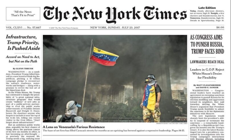 Ahora, quise saber como informa el New York Times (NYT) sobre el nuevo episodio de guerra sicológica imperial contra Venezuela. Este medio que trasunta de liberal y que por estar cerca del partido demócrata de Estados Unidos tiene contradicciones con la actual administración, no pasa de ser una de las principales herramientas de desinformación del despotismo imperial y ha sido desde siempre, un poderoso instrumento en manos del enemigo para enfrentar a Venezuela. Su manejo de la información trasluce la intención de utilizar elementos de la situación internacional para atacar a Trump y su ejecutoria a partir de una mirada interna de la política.