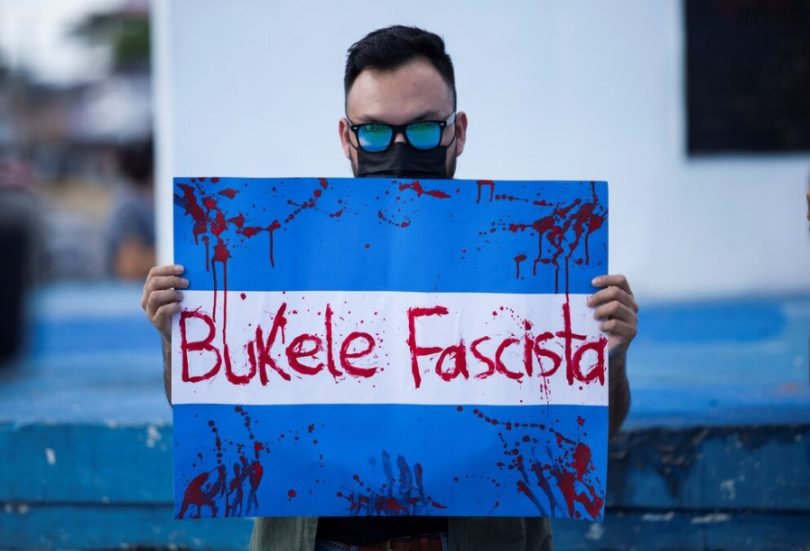 Foto de portada: Un manifestante sostiene una pancarta que dice “Bukele fascista” . REUTERS / Víctor Pena