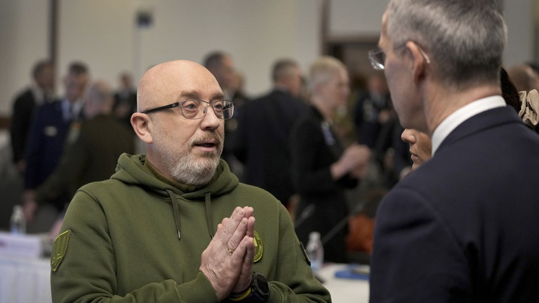 Foto de portada: FOTO DE ARCHIVO: El ministro de Defensa ucraniano, Oleksii Reznikov, hace un gesto mientras habla con el secretario general de la OTAN, Jens Stoltenberg, en la base aérea de Ramstein en Alemania, el viernes 20 de enero de 2023 © AP / Michael Probst.