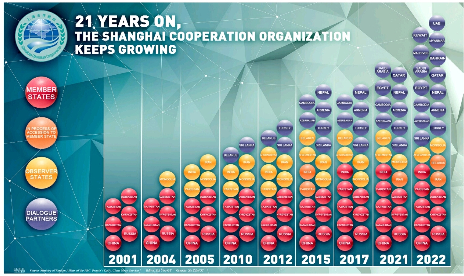 El siguiente diagrama muestra claramente la expansión horizontal de la OCS de 2001 a 2022.