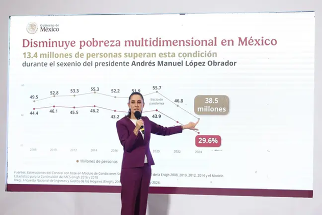 Uno de los ejes centrales fue la política económica. Sheinbaum inició defendiendo la continuidad del modelo iniciado por su antecesor, el expresidente Andrés Manuel López Obrador, con énfasis en la reducción de la pobreza y la desigualdad. “Con un nuevo proyecto de justicia social, sacó de la pobreza a más de 13.5 millones de personas. Es pertinente mencionarlo cuantas veces sea necesario”, insistió en recordar. En cifras concretas, la pobreza pasó del 41.9% en 2018 al 29.5% en 2024, y el coeficiente de Gini cayó a 0.391, que ahora hacen de México el segundo país con menor desigualdad de América, después de Canadá.