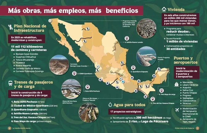 El informe subrayó una ambiciosa agenda de infraestructura, enmarcada dentro del Plan Lázaro Cárdenas del Río. Entre los proyectos para su sexenio sobresalen: seis trenes de pasajeros y carga (incluyendo el Tren Interoceánico y la primera etapa del Tren Maya de carga), y modernización de nueve puertos y dos aeropuertos