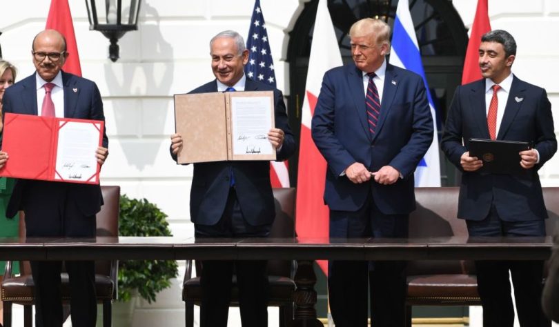 Foto de portada: El ministro de Relaciones Exteriores de Bahrein, Abdullatif al-Zayani; el primer ministro de Israel, Benjamin Netanyahu; el presidente de Estados Unidos, Donald Trump; y el ministro de Relaciones Exteriores de Emiratos Árabes Unidos, Abdullah bin Zayed Al-Nahyan, el 15 de septiembre de 2020 durante la firma de los “Acuerdos de Abraham” / AFP via Getty Images