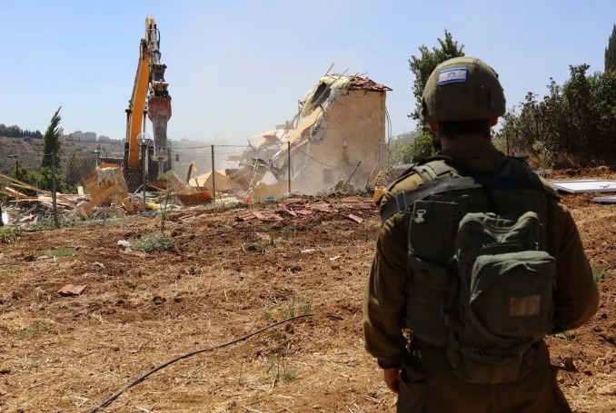 Soldados israelíes demuelen un edificio palestino en la denominada Zona C, en la Cisjordania ocupada. / WAFA
